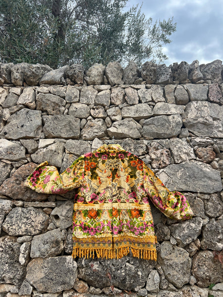 Editor's Notes - Cara Mia May’s kimono jacket is made in Italy from vintage velvet bedspread with its original fringe. The rich velvety silhouette has delicate flower motifs, a pair of cherubs at the back and its sleeves, with a turtle collar keeping your neck warm and defined pockets keeping your hands cosy. It’s a chic jacket that pairs well with our embroidered velvet pyjamas set.