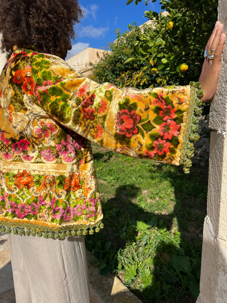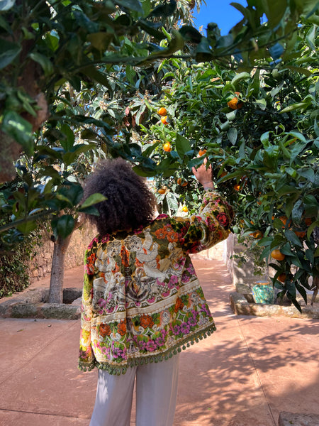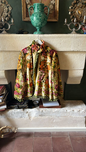Editor's Notes - Cara Mia May’s kimono jacket is made in Italy from vintage velvet bedspread with its original fringe. The rich velvety silhouette has pink, orange, green, golden hues with delicate flower motifs, a pair of cherubs at the back and its sleeves, with a turtle collar keeping your neck warm and defined pockets keeping your hands cosy. It’s a chic jacket that pairs well with our embroidered velvet pyjamas set.